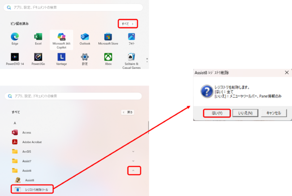 Windowsマークからアプリの[すべて]→[Assist8]を展開し、[レジストリ削除ツール]をクリックします。