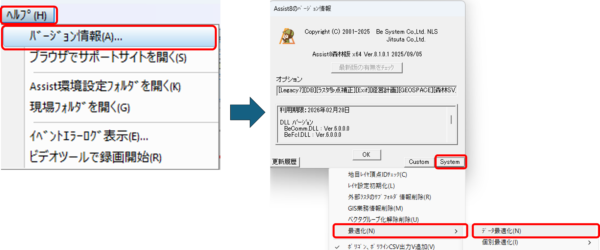 [ヘルプ]→[バージョン情報]→[System]→[最適化]→[データ最適化]